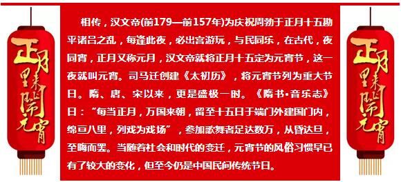 農(nóng)歷正月十五是“元宵節(jié)”,此節(jié)日民間有掛燈、打燈、觀燈燈習俗,故也稱燈節(jié)。鬧花燈是元宵節(jié)傳統(tǒng)節(jié)日習俗,始于西漢,興盛于隋唐。隋唐以后,歷代燈火之風盛行,并沿襲傳于后世。而正月十五,又是一年一度的鬧花燈放煙火的高潮。