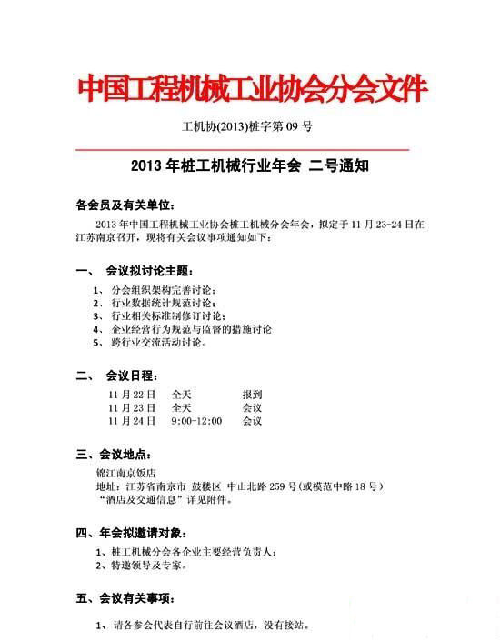 摘要:2013年中國工程機(jī)械工業(yè)協(xié)會樁工機(jī)械分會年會,將于11月23—24在江蘇南京錦江南京飯店召開。