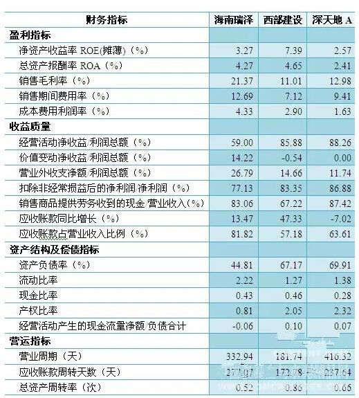 西部建設、深天地的資產(chǎn)負債率復合行業(yè)平均水平,海南瑞澤負債率較低,償債風險偏低,同時其他償債指標也顯示海南瑞澤具有較低的債務風險,但由于經(jīng)營活動產(chǎn)生的現(xiàn)金凈流量為負值,因此主營業(yè)務正常經(jīng)營的償債能力較弱,有待提升業(yè)務正常經(jīng)營的穩(wěn)定性和盈利能力。