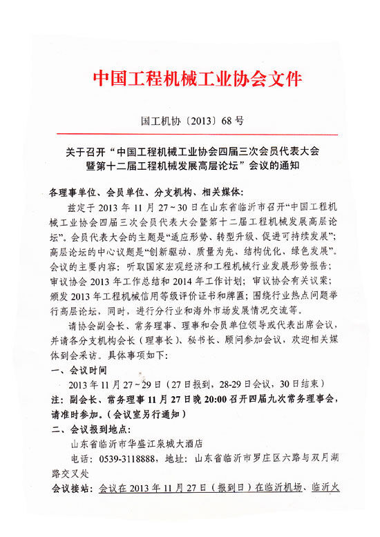 關(guān)于召開“中國工程機械工業(yè)協(xié)會四屆三次會員代表大會”會議的通知