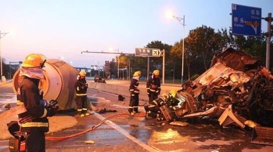 到達(dá)現(xiàn)場后,消防官兵經(jīng)過現(xiàn)場偵查發(fā)現(xiàn)水泥攪拌車與路中央護(hù)欄猛烈碰撞。事故中,攪拌車車頭損毀嚴(yán)重,車頭零部件散落一地,攪拌車司機(jī)被變形的車頭緊緊卡住,無法動(dòng)彈,情況萬分危急。了解情況后,消防官兵決定利用液壓擴(kuò)張器和撐頂桿對(duì)駕駛室變形部位進(jìn)行破拆,對(duì)被困人員實(shí)施營救,并做好現(xiàn)場警戒,防止發(fā)生二次事故。