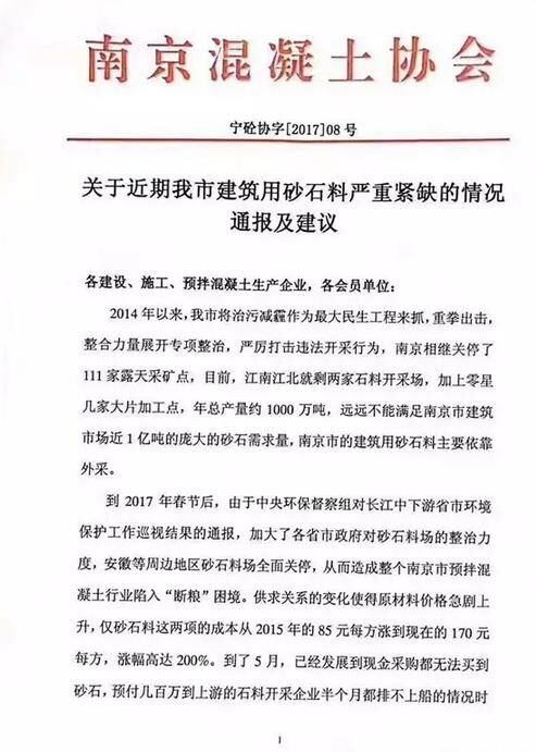 5月26日,南京混凝土協(xié)會關(guān)于近期南京市建筑用砂石料嚴重緊缺的情況發(fā)布通報及建議。公告中提到:目前江南江北僅剩的兩家石料開采場遠遠不能滿足南京市建筑市場近1億噸的砂石需求量,全市建筑用砂石料主要依靠外采。尤其是在今年春節(jié)以后,中央環(huán)保督察組對長江中下游省市環(huán)境保護巡視結(jié)果的通報,加大了各省市政府對砂石料場的整治力度,周邊地區(qū)砂石料場全面關(guān)停,從而造成全市預(yù)拌混凝土行業(yè)陷入“斷糧”的困境,這也直接導(dǎo)致原材料價格急劇上升。