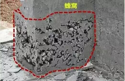 蜂窩有表面的、深井的和貫通的三種,也常遇到水平的、傾斜的、斜交的單獨(dú)蜂窩和相連的蜂窩群,其表現(xiàn)為局部表面酥松,無水泥漿,粗骨料外露深度大于5mm(小于混凝土保護(hù)層厚度),石子間存在小于最大石子粒徑的空隙,呈蜂窩狀,有蜂窩處的混凝土強(qiáng)度很低。