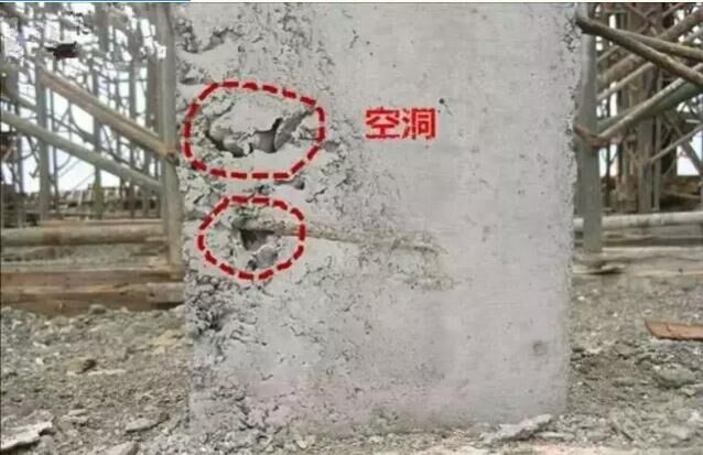 由于混凝土灌注時(shí)有一些部位堵塞不通,構(gòu)件中就會產(chǎn)生空洞,空洞不同與蜂窩,蜂窩的特征是存在于未搗實(shí)的混凝土或缺水泥漿;而空洞卻是局部或全部沒有混凝土??斩吹某叨韧ǔ]^大,以至于鋼筋全部裸露,造成構(gòu)件內(nèi)貫通的斷缺以至于結(jié)構(gòu)發(fā)生整體性破壞。