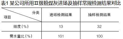 優(yōu)質(zhì)的粉煤灰摻入混凝土可明顯地改善混凝土的和易性,當(dāng)粉煤灰摻量大于膠材總量的5%~10%時,效果極為明顯?,F(xiàn)今在混凝土實(shí)際生產(chǎn)中,粉煤灰摻量往往達(dá)到20%,有的甚至高達(dá)30%,但混凝土的和易性卻不盡人意。抽取原材料進(jìn)行檢測時,發(fā)現(xiàn)粉煤灰的檢測結(jié)果經(jīng)常不滿足標(biāo)準(zhǔn)要求或者與驗(yàn)收時的結(jié)果相差甚遠(yuǎn)。現(xiàn)以某公司所用Ⅱ級粉煤灰進(jìn)場及抽樣常規(guī)檢測結(jié)果進(jìn)行對比,見表1。