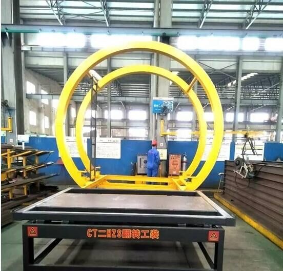 該工裝適用于HZS系列混凝土攪拌站所有水箱、外加劑箱、控制室生產(chǎn)過程中的翻轉(zhuǎn)焊接。工裝工件采用軌道輸送,四角螺旋定位,平穩(wěn)快速;可調(diào)節(jié)過渡軌道,可移動踏板,方便快捷,安全可靠。