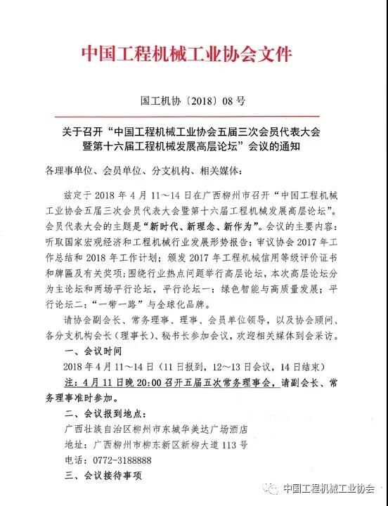中國工程機(jī)械工業(yè)協(xié)會茲定于2018年4月11~14日在廣西柳州市召開“中國工程機(jī)械工業(yè)協(xié)會五屆三次會員代表大會暨第十六屆工程機(jī)械發(fā)展高層論壇”。會員代表大會的主題是“新時(shí)代、新理念、新作為”。