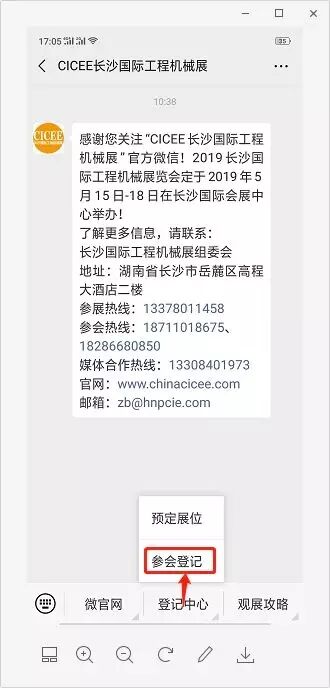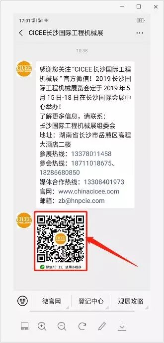 第1步,掃碼關(guān)注“CICEE長(zhǎng)沙國(guó)際工程機(jī)械展”微信公眾號(hào),點(diǎn)擊“參會(huì)登記”,獲取小程序二維碼。