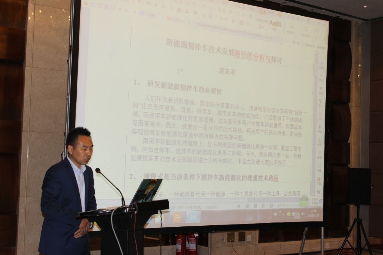 安徽星馬專用汽車有限公司總經理助理裴志軍先生從國內外攪拌車的發(fā)展現(xiàn)狀出發(fā),作了“增程式是當前條件下攪拌車新能源化的理想技術路徑”和“增程式在攪拌車上應用前景展望”的《新能源攪拌車技術發(fā)展路徑的分析與探討》報告。