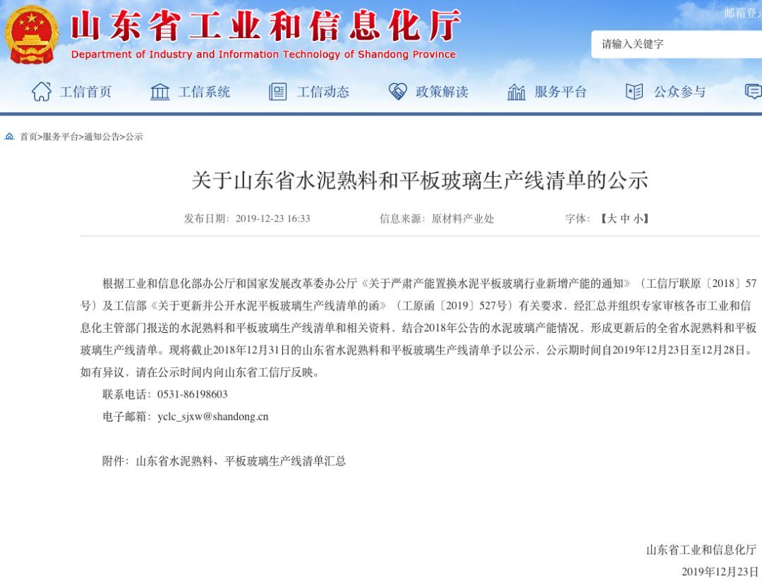 12月23日,山東省工信廳發(fā)布《關(guān)于山東省水泥熟料和平板玻璃生產(chǎn)線清單的公示》,經(jīng)匯總并組織專家審核各市工業(yè)和信息化主管部門報送的水泥熟料和平板玻璃生產(chǎn)線清單和相關(guān)資料,結(jié)合2018年公告的水泥玻璃產(chǎn)能情況,形成更新后的全省水泥熟料和平板玻璃生產(chǎn)線清單。