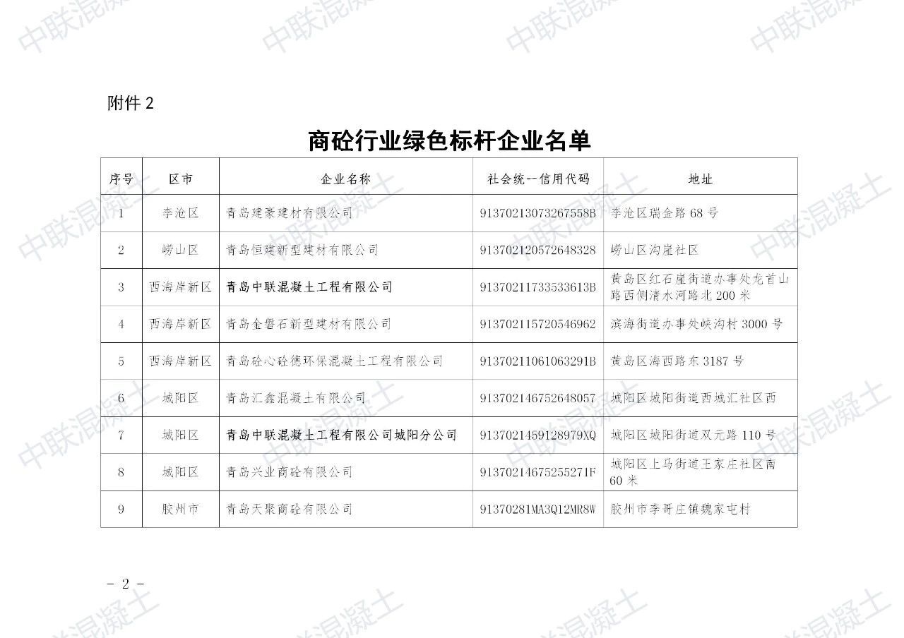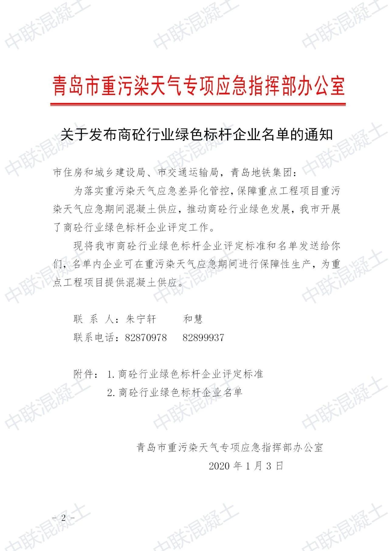 2020年1月3日,青島市重污染天氣專項(xiàng)應(yīng)急指揮部辦公室發(fā)布商砼行業(yè)綠色標(biāo)桿企業(yè)名單,全市170余家混凝土企業(yè)僅有15家通過評(píng)定,青島中聯(lián)混凝土和城陽分公司獨(dú)占2席。