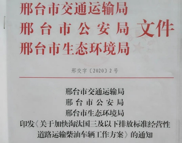 自2020年4月1日起,全天24小時(shí)禁止國(guó)三標(biāo)準(zhǔn)柴油貨車在本市S20外環(huán)高速以內(nèi)的道路上行駛。自2020年4月1日起,全天24小時(shí)禁止國(guó)三標(biāo)準(zhǔn)柴油貨車(不含國(guó)三標(biāo)準(zhǔn)柴油冷藏車和已加裝尾氣凈化裝置的國(guó)三標(biāo)準(zhǔn)柴油集裝箱運(yùn)輸車輛)在本市S20外環(huán)高速以內(nèi)的道路上(不含S20外環(huán)高速以及S20外環(huán)高速高架段投影下的地面道路)行駛。S20外環(huán)高速包括S20外環(huán)高速與G1503上海繞城高速在外環(huán)隧道至五洲大道的共線段。3、河北邢臺(tái)6月底前淘汰全部國(guó)三柴油車