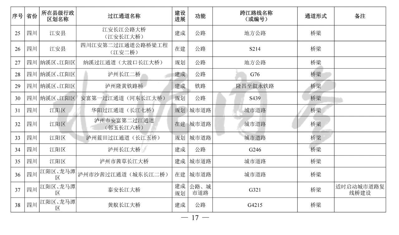 重慶市(17座):市域(郊)鐵路跳蹬至江津線長江大橋、西彭長江大橋(支坪長江大橋)、小南海長江大橋、中壩過江通道、黃桷坪長江大橋、軌道27號線過江通道、重慶至黔江鐵路過江通道、黃桷沱大橋、長壽長江三橋、涪陵石沱長江大橋、涪陵龍頭港長江大橋、涪陵江北長江大橋、興義長江大橋、西沱長江大橋、云陽復興長江大橋、奉節(jié)二橋、巫山長江二橋