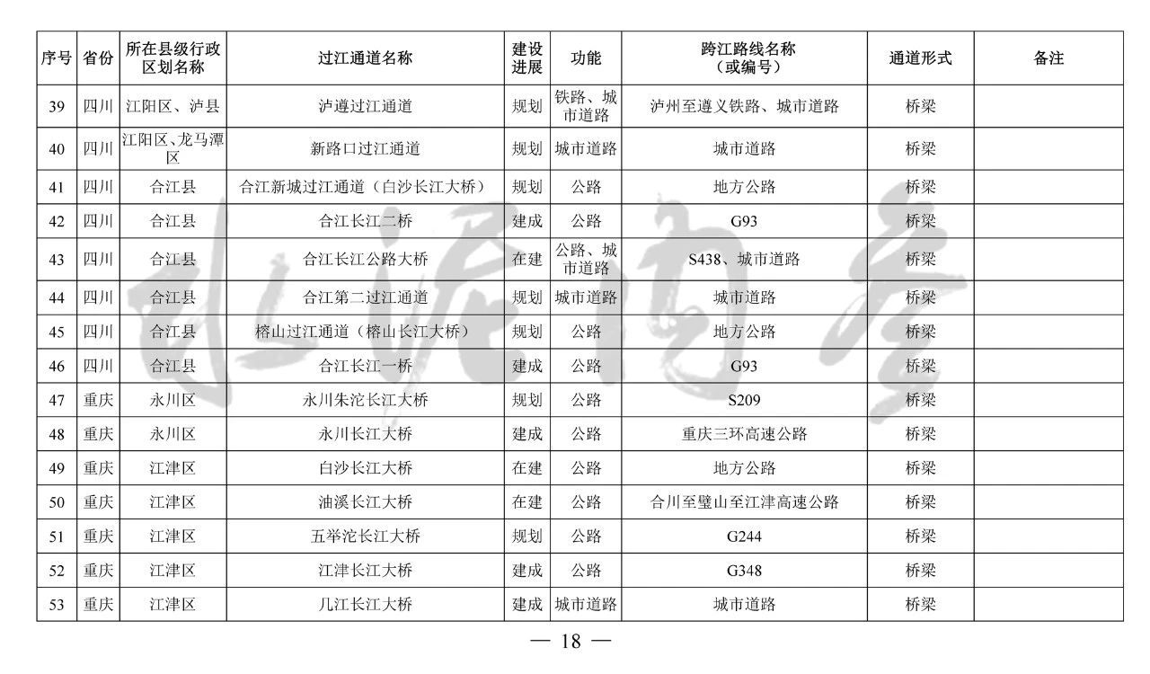 其中,到2035年規(guī)劃布局長江干線過江通道276座,其中四川省45座、重慶市75座、湖北省69座、安徽省32座、江蘇省41座、上海市3座、滇川界1座、鄂湘界2座、鄂贛界6座、贛皖界2座。