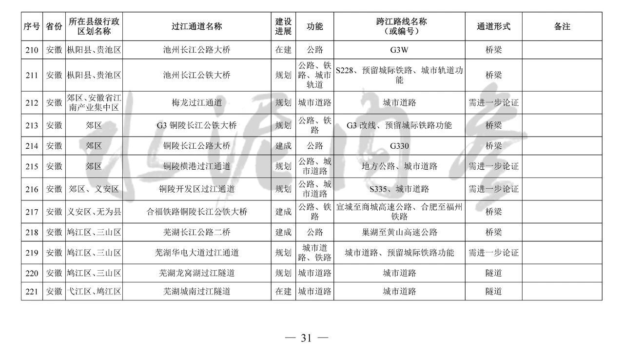 安徽?。?座):望江長江公鐵大橋、安慶海口長江公路大橋、池州長江公鐵大橋、G3銅陵長江公鐵大橋、銅陵開發(fā)區(qū)過江通道、蕪湖北京路過江隧道、蕪湖泰山路長江公鐵大橋、馬鞍山長江公鐵大橋、馬鞍山九華路過江通道