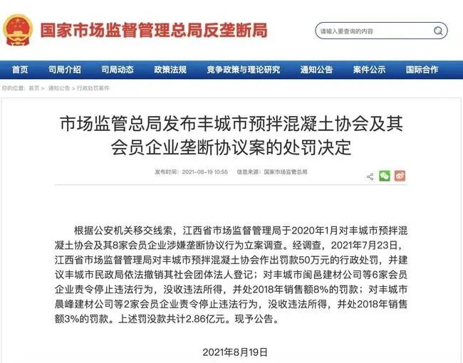 8月18日,國(guó)家市場(chǎng)監(jiān)管總局發(fā)布通報(bào),江西省市場(chǎng)監(jiān)督管理局對(duì)豐城市預(yù)拌混凝土協(xié)會(huì)及其會(huì)員企業(yè)壟斷協(xié)議一案,合計(jì)罰沒(méi)約2.86億元。