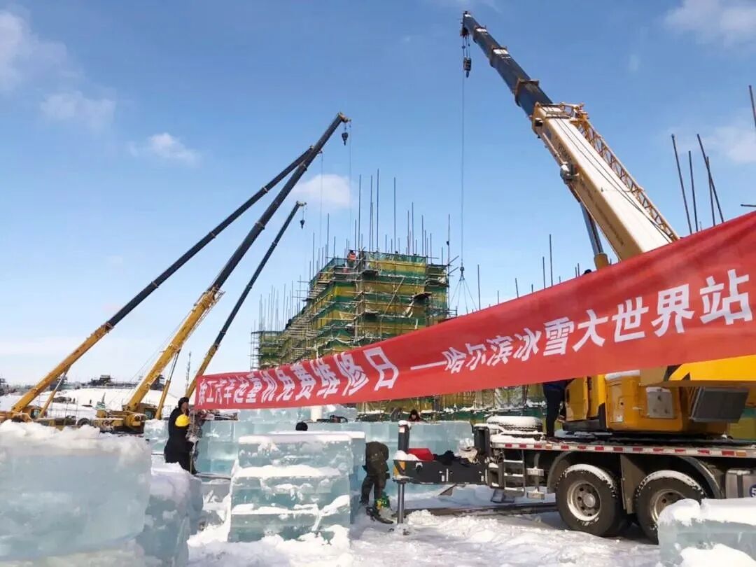 第21屆哈爾濱冰雪大世界建設(shè)現(xiàn)場(chǎng),XCT25、QY25K5-1、QY70k-1在內(nèi)的50多臺(tái)徐工起重設(shè)備將無(wú)數(shù)個(gè)“量重面滑”、重達(dá)一噸的冰塊無(wú)縫堆砌。