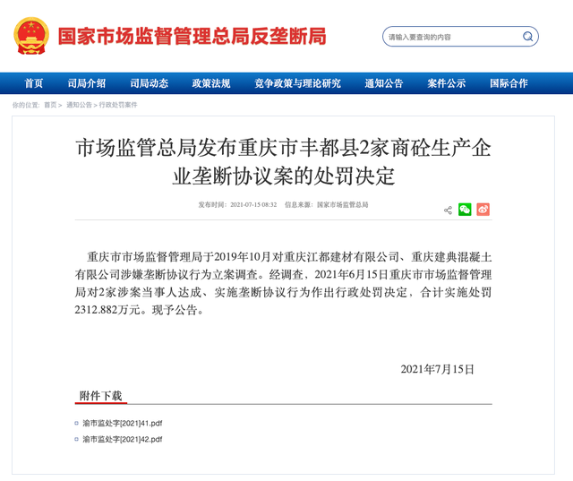 2021年7月15日,市場(chǎng)監(jiān)管總局發(fā)布重慶市豐都縣2家商砼生產(chǎn)企業(yè)壟斷協(xié)議案的處罰決定。處罰決定顯示,合計(jì)實(shí)施處罰2312.882萬(wàn)元。