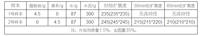 為了初步判斷這兩種外加劑對(duì)海螺牌水泥的適應(yīng)性問題,首先調(diào)和成同樣固含量為的溶液,實(shí)驗(yàn)數(shù)據(jù)詳見表1: