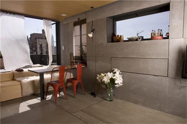 床的亮點設(shè)計在于它是可以伸縮的。白天可以推進去,這里充當(dāng)飄窗的作用。墻面也是頗有創(chuàng)意和實用性,隱藏在墻上的混凝土板,拉下來變成方便的書桌或是餐桌。