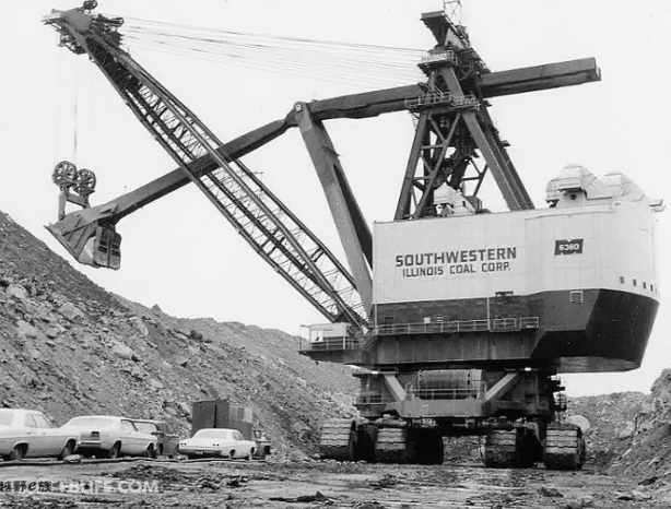 這個(gè)電鏟1965年問(wèn)世,組裝它花了約兩年時(shí)間,最終的建造費(fèi)用在當(dāng)時(shí)超過(guò)1500萬(wàn)美元,在美國(guó)Southwestern Illinois的“Captain”露天煤礦使用,其高度相當(dāng)于21層樓,使用7000V的高壓電,行走裝置為8條履帶,斗臂長(zhǎng)度為41米,最大挖掘高度67.2 m,是迄今全球最大的電鏟,因火災(zāi)毀損于1992年爆破拆解,一生的挖掘量達(dá)到6億2千萬(wàn)方。沒(méi)有見證這一奇跡真是遺憾吶~