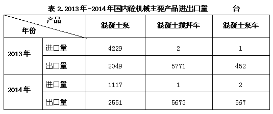 截止到2014年底,中國工程機械主要產(chǎn)品保有量約為650萬-704萬臺。其中,混凝土攪拌運輸車29.2萬-31.6萬臺,混凝土泵車5.9-6.3萬臺,混凝土泵6.3萬-6.8萬臺,混凝土攪拌站4.7萬-5.2萬臺。