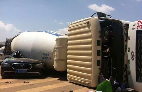 景明北路與陽(yáng)春大道交叉口處有多條明顯的剎車痕跡,其中一條較寬疑似攪拌車的剎車痕跡長(zhǎng)約二三十米。牌照為云ABXX20的攪拌車向右側(cè)翻后,駕駛室受損嚴(yán)重,玻璃脫落,車內(nèi)物品散落一地。倒下的罐體壓住了一輛黑色云A6XXVS牌照的寶馬740i轎車,轎車的整個(gè)左半邊幾乎被壓平,整車車胎全部爆裂,尤其是駕駛室被壓得最為嚴(yán)重,站在車外根本看不見內(nèi)部情況。有現(xiàn)場(chǎng)目擊者稱,當(dāng)時(shí)攪拌車側(cè)翻壓到寶馬車之后,車子還往前硬生生推出了近30米。