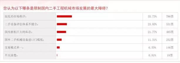 工程機(jī)械區(qū)別于其他行業(yè)一個(gè)重要的地方是,二手商品的回收利用尤為重要,因?yàn)橐粋€(gè)機(jī)械的生命周期相對(duì)于快消品來(lái)說(shuō)更長(zhǎng),所以在二手商品的回收、租賃同樣存在巨大機(jī)會(huì)。但是該行業(yè)目前發(fā)展前景不明朗。在慧聰工程機(jī)械網(wǎng)的一項(xiàng)“限制二手工程機(jī)械市場(chǎng)發(fā)展的最大障礙”的投票中,“混亂的市場(chǎng)秩序”得票最高,796票,“二手設(shè)備評(píng)估體系不健全”排名第二,得票531,“國(guó)內(nèi)新機(jī)的巨大庫(kù)存”排名第三,得票485。