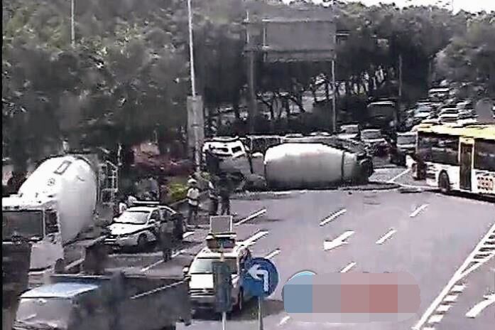 攪拌車撞擊后,可能猛打了方向盤,突然失控,側(cè)翻在地,占了兩個車道,加上泥漿傾倒下來,對交通影響很大。