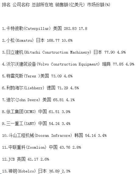 分析指出,受大宗商品價格下跌、新型經(jīng)濟體經(jīng)濟增速減緩和世界經(jīng)濟不景氣的影響,全球前50家工程機械制造企業(yè)總產(chǎn)值較上一年度下跌16.2%,達到1330億美元,創(chuàng)2009年以來新低。據(jù)中國工程機械商貿網(wǎng)編輯了解,2009年,工程機械行業(yè)一年銷售額下降了1090億美元。自那時起,工程機械行業(yè)收入下降趨勢一直未有改變。報告同時強調,榜單上下滑最為嚴重的是中國企業(yè),這很大程度上是因為中國經(jīng)濟增速的放緩。中國企業(yè)中,只有徐工集團仍然保持在前十強,位列榜單第九位?!斑@個市場趨勢表現(xiàn)最顯著的就是中國建筑設備制造商,相比去年,所有中國企業(yè)的排名有所下滑。排名前十的企業(yè)中,如今只有徐工一家中國工程機械制造廠商?!?/span>