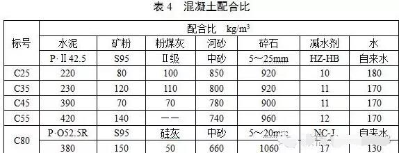 各標(biāo)號混凝土工作性能良好,坍落度在180mm~210mm之間,無離析、泌水現(xiàn)象,各標(biāo)號混凝土配合比如表4所示。