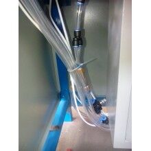 將膩?zhàn)臃郯b袋套在出料嘴上,撥動(dòng)彈簧開(kāi)關(guān),壓袋氣缸開(kāi)始工作并壓住袋口,控制器將包裝袋重量自動(dòng)去除,通過(guò)空壓機(jī)的氣流經(jīng)三分管分成三路,其中一路去往進(jìn)料口進(jìn)行破拱,保證下料暢通。葉輪高速轉(zhuǎn)動(dòng)迅速將物料撥出灌入袋中,隨袋中空氣一起溢出的粉塵經(jīng)排氣孔排出(對(duì)環(huán)保要求高的用戶(hù)也可連接吸塵器,由除塵器吸走)。待加料達(dá)到粗流設(shè)定值(L1)時(shí),氣缸自動(dòng)將橡膠軟管夾至1/2開(kāi)口,出料速度減慢,到總設(shè)定(L2)時(shí),氣缸將橡膠軟管完全夾死,出料停止,壓袋氣缸松開(kāi)袋口,灌裝結(jié)束。