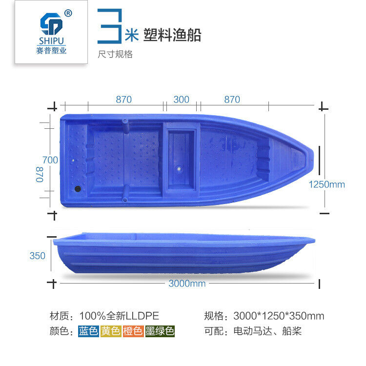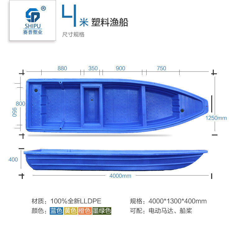 重慶賽普塑料捕魚船采用進(jìn)口韓國LLDPE材質(zhì),采用國外先進(jìn)的滾塑工藝整體加工制成。一次成型,無縫焊接。,成本低,穩(wěn)定性強(qiáng),抗撞擊,耐老化,無需維修。效果遠(yuǎn)超玻璃鋼漁船。使用年限長達(dá)30年以上,是新一代的漁船。欲購從速!13650528299(微信同號)