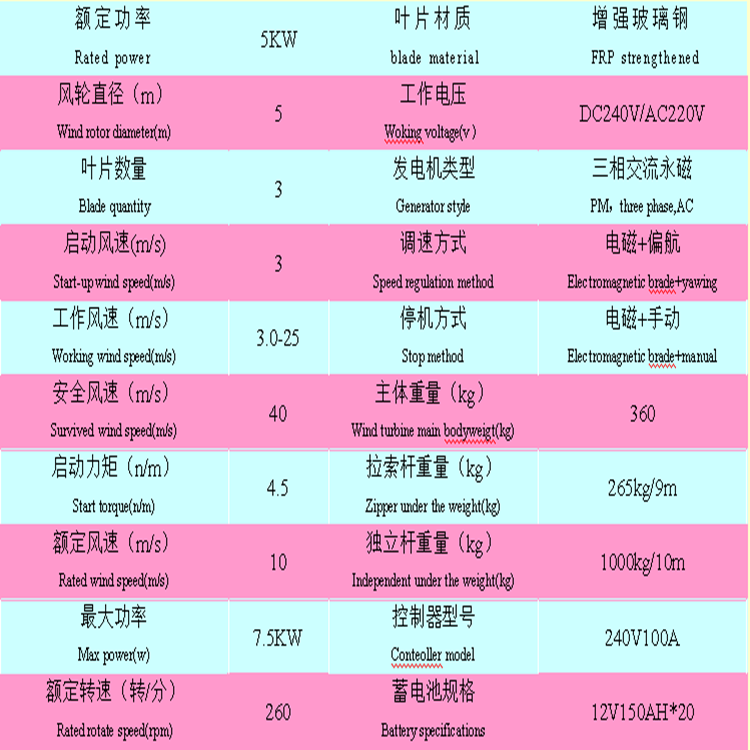 5KW風力發(fā)電機可以帶電視機、照明、電風扇、洗衣機、冰箱、電飯鍋、水泵、空調(diào)及其他電器。