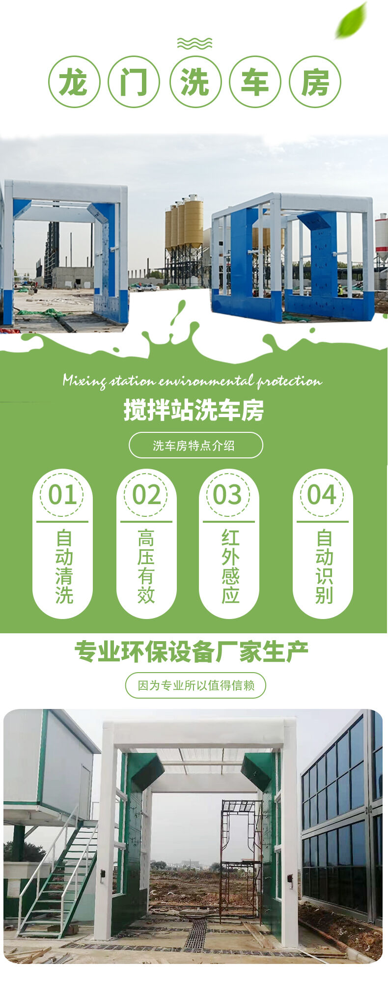 針對(duì)混凝土攪拌站研發(fā)的固定式工程車輛洗車房,其主要作用是清洗攪拌罐車進(jìn)料口、車輪、底盤及車身,通過高壓噴頭沖洗可以有效去除清洗部位的泥土灰塵以及未凝固的水泥漿,避免了攪拌車身殘留混凝土四處散落對(duì)環(huán)境的 影響。