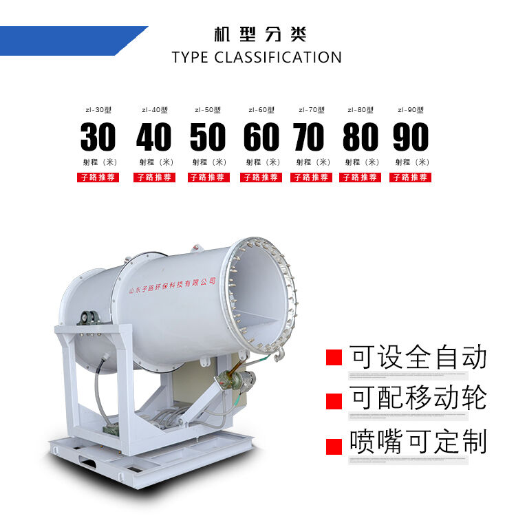 直徑相近的水霧和的粉塵顆粒黏貼,減小水表面的張力,使粉塵顆粒與水霧聚結成團,在重力作用下,然后沉降到地面。達到有效降塵的目的。霧炮機的噴水距離為30到150米,具體規(guī)格可以定制,配套水箱可選3-10噸,主要作用是噴霧抑塵,
