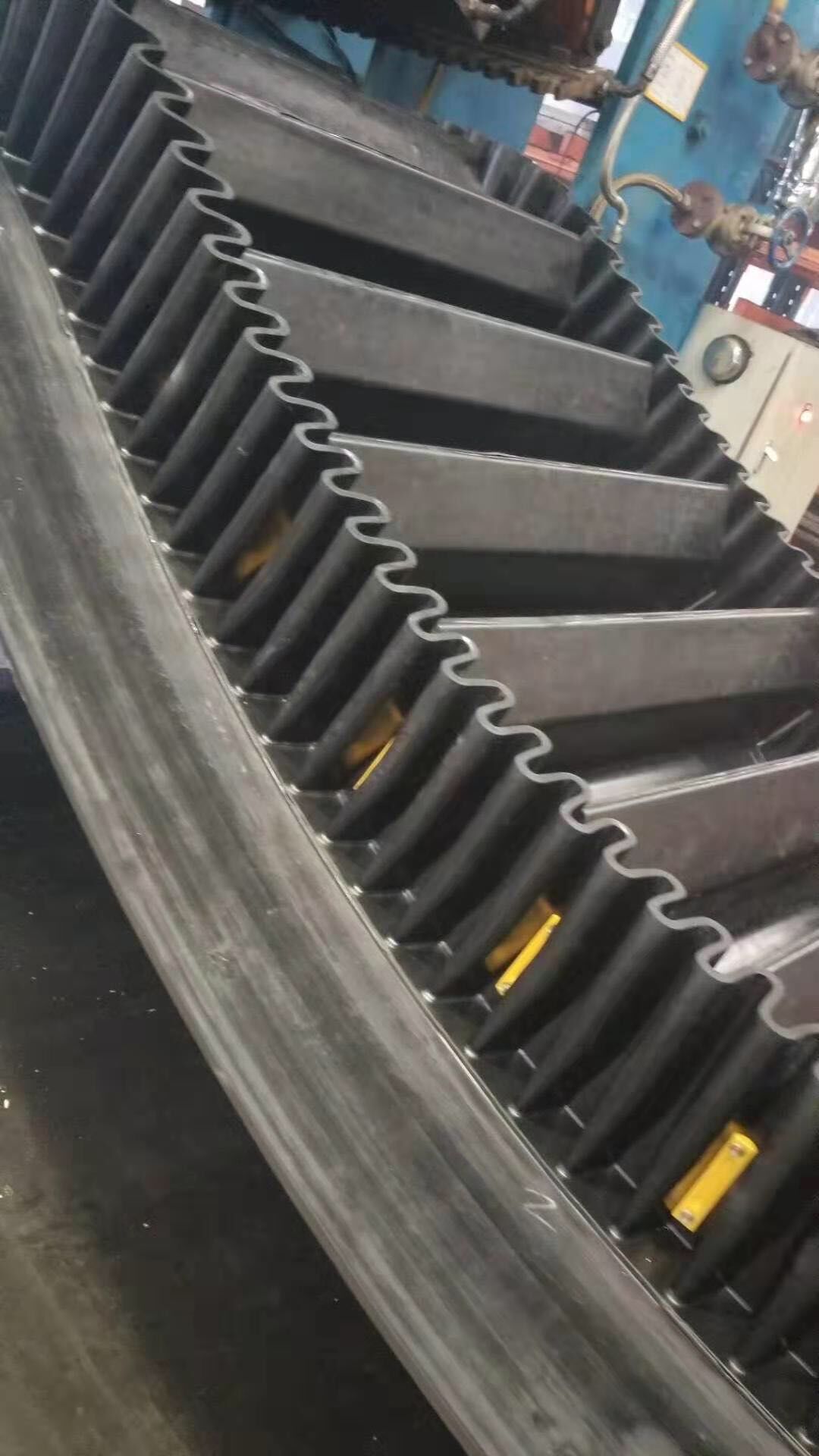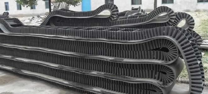 大傾角波狀擋邊帶由基帶、擋邊、橫隔板3部分組成。擋邊起防止物料測滑撒落的作用。為便于繞過滾筒,檔邊設(shè)計成波紋狀;橫隔板的作用是承托物料,為了實現(xiàn)大傾角輸送,采用TTC型。檔邊和橫隔板是用二次硫化的方法與基帶連接的,具有很高的連接強(qiáng)度。
