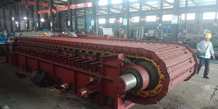 5、頭尾輪應(yīng)采用優(yōu)質(zhì)鑄鋼件并經(jīng)良好的熱處理,應(yīng)帶有張緊裝置。喂料倉與板喂機(jī)之間應(yīng)設(shè)有溜槽,板喂機(jī)帶支架和支腿。