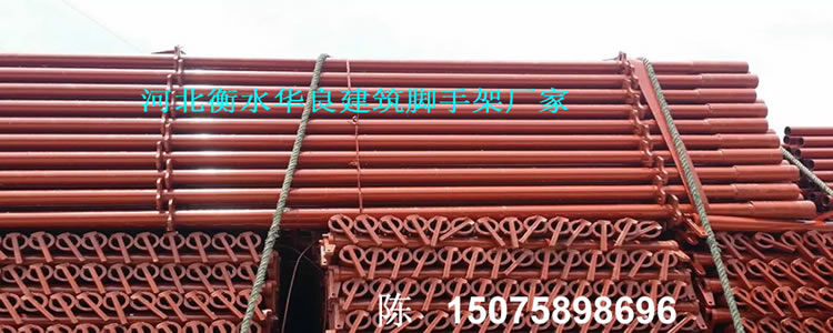 河北衡水華良建筑器材聯(lián)系電話:150-7589-8696 ,輪扣腳手架、碗扣腳手架、快拆式腳手架、承插式新型腳手架、直插式腳手架、鋼管腳手架、建筑腳手架,新型建筑支撐,腳手架,模板支撐,新型模板支撐, 新型建筑支撐。這種新型材料的特點是:耐腐蝕,彈性大,堅固不變形。易搭拆腳手架,施工速度快的腳手架。 每根支撐桿可以支撐3-4噸左右,兩根主龍脊之間可以承重2-2.5噸的重量,每根副龍脊可以承重1噸?,F(xiàn)在工地現(xiàn)澆水泥一般厚度也就是10-15厘米,同等面積重量最多100-150公斤,所以這個支撐力度一般高層建筑完全夠用。
