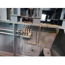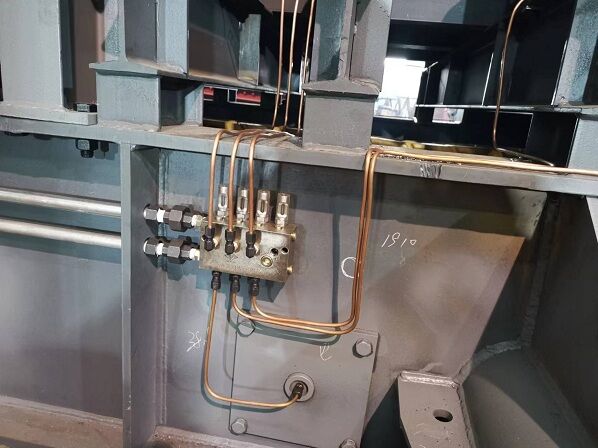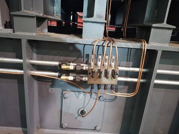 重型板式給料機潤滑系統(tǒng)由儲油罐、油泵、閥門、潤滑管路、油壓傳感變送器和PLC控制器組成。由于板式給料機的潤滑口較多,若采用單一管路同時對各潤滑口注入潤滑脂,不但會使油泵的功率和主管路的壓力增加,而且各潤滑口施加的壓力不均勻,影響潤滑效果。因此,本系統(tǒng)采用分段潤滑的方法,用電磁閥控制各個潤滑管路。該系統(tǒng)有油泵電.機,油壓傳感變送器,潤滑管路總閥門,4個分段潤滑管路分閥門等組成。由于電磁閥安全、控制方便,可靠性高,系統(tǒng)均采用電磁閥。重型板式給礦機自動潤滑系統(tǒng)應滿足以下控制要求: