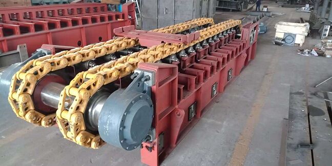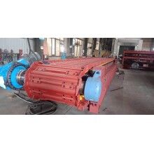座部件由機(jī)架和支承件組成。機(jī)架由鋼材焊接而成,支承部件有支重輪、下托輪和縱向?qū)к?,輸送板得到支重輪和縱向?qū)к壍碾p重支持,使支重更均勻合理。牽引鏈基本上不受礦石和自重產(chǎn)生的張力作用,支重輪外側(cè)設(shè)計(jì)有凸臺,與主、從動(dòng)輪聯(lián)合作用,成功地杜絕鏈軌跑偏。在機(jī)架下方設(shè)有下托輪,為方便維修,下托輪為側(cè)裝式。