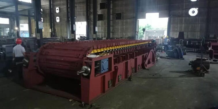 2)經(jīng)過浮選機(jī)進(jìn)行浮選的金礦粉料,加入了浮選藥劑,物料濕度較大,有粘性,同時(shí)有可能結(jié)成塊狀。由于物料的特殊性這道工序的配套輸送設(shè)備比較關(guān)鍵:料斗一次抓料十多噸,物料對輸送機(jī)有較大的沖擊力。所以這道工序選擇的輸送機(jī)要能承受物料沖擊,也要能輸送粘性物料,同時(shí)該輸送機(jī)具有打散功能,把結(jié)成塊的物料打散。這道工序的輸送機(jī)通常采用我公司研制的新型皮帶板式給料機(jī),可滿足以上要求。