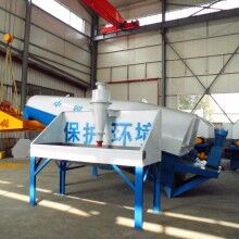 落地式砂石分離機整套系統(tǒng)主要由:攪拌車加水清洗裝置,溜槽裝置,砂石漿水分離裝置,和泥漿水后處理裝置組成?;炷凛斔驮O(shè)備清洗后,將殘余混凝土排入溜槽中,在高壓水流沖擊下,經(jīng)溜槽進入砂石分離機,在不斷旋轉(zhuǎn)的分離機作用下,對混凝土進行充分的清洗,同時將砂石、漿水進行分離,分離后的砂、石在導(dǎo)料葉片的作用下背向流動至出料口排出分離機落入振動篩分機,通過篩分將沙、石子分開,分別堆放。清洗后的漿水從分離機的溢水口排出進入濃漿池,經(jīng)污水泵加壓打到旋流器除去多余固體微粒,降低漿水濃度,進入攪拌池回收利用。進入攪拌池的漿水為了防止沉淀凝固,需通過攪拌器的作用,攪拌器的工作為間歇式。分離出水泥漿在連續(xù)的攪拌器作用下,再通過高壓污水泵輸送到攪拌樓中待生產(chǎn)再利用。整個控制系統(tǒng)設(shè)有手動和自動控制,方便控制設(shè)置,整個系統(tǒng)運行可靠,故障率低,維護量少等特點。