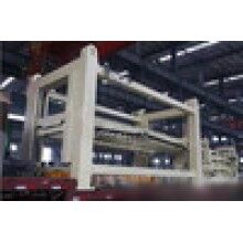 靜停養(yǎng)護(hù)達(dá)到切割強(qiáng)度后,模框由翻轉(zhuǎn)行車吊運(yùn)至切割機(jī)工位上,翻轉(zhuǎn)吊具將??蚍D(zhuǎn)90°放在切割小車支座上,然后由翻轉(zhuǎn)吊具機(jī)械手自動(dòng)開啟???、脫模,把坯體連同側(cè)板側(cè)立在第一輛切割小車上,脫下的??蚯謇砗笈c蒸養(yǎng)返回的經(jīng)清理噴油后的側(cè)板組合成模具,等待澆注。在組模的同時(shí),脫模后的坯體在切割機(jī)上分部做定點(diǎn)切割,首先第一輛切割小車帶動(dòng)坯體行走經(jīng)過縱切裝置進(jìn)行縱向切割,坯體在進(jìn)行縱向切割時(shí),分別由切割刀片和由汽缸張緊的切割鋼絲同時(shí)完成側(cè)面、面包頭及頂面廢料的切割與清理,縱切結(jié)束后,切割小車?yán)^續(xù)行走至橫切裝置中央位置停止,橫切架自上而下垂直降落進(jìn)行坯體的橫向切割,橫切時(shí)切割鋼絲作鋸裝擺動(dòng),完成坯體的鋸裝橫向切割。坯體切割完成后,人工推鏟出去頂部面包頭。小車置換裝置啟動(dòng),由切割機(jī)下方小車置換油缸將切割好的坯體連同側(cè)板頂起,下方第一輛小車返回起始位置,去承載新的帶切割的坯體,第二輛小車替換第一輛小車位置,并承載坯體及側(cè)板行走至預(yù)定位置,最后坯體由半成品吊車連同地板吊運(yùn)至釜前蒸養(yǎng)小車上,在軌道上進(jìn)行編組。