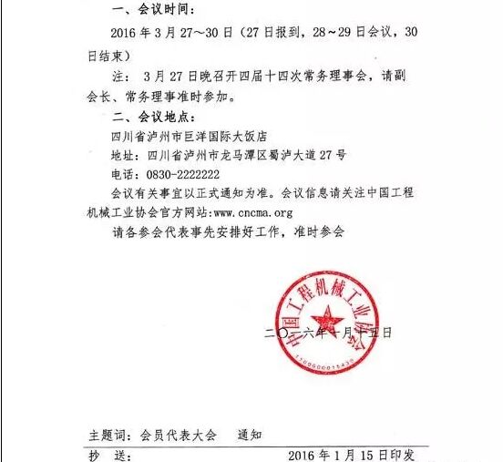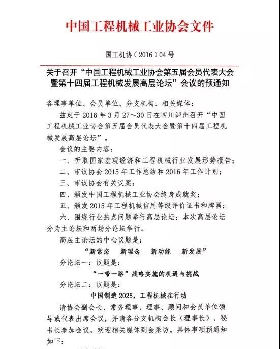茲定于2016年3月27日~30日在四川瀘州召開“中國工程機(jī)械工業(yè)協(xié)會第五屆會員代表大會暨第十四屆工程機(jī)械發(fā)展高層論壇”。
