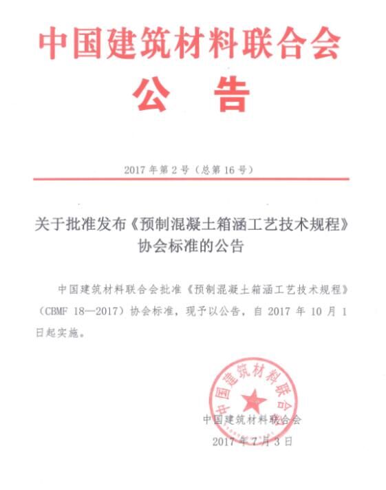 2017年7月,由中國混凝土與水泥制品協(xié)會(huì)(以下簡稱協(xié)會(huì))組織制定的《預(yù)制混凝土箱涵工藝技術(shù)規(guī)程》和《混凝土用氧化鎂膨脹劑》兩項(xiàng)協(xié)會(huì)標(biāo)準(zhǔn),通過審定并發(fā)布批準(zhǔn)公告,標(biāo)準(zhǔn)號(hào)分別為CBMF 18-2017和CBMF 19-2017,將同時(shí)于2017年10月1日起實(shí)施。這是國務(wù)院《深化標(biāo)準(zhǔn)化工作改革方案》(國發(fā)[2015]13號(hào))及質(zhì)檢總局、國家標(biāo)準(zhǔn)委《關(guān)于培育和發(fā)展團(tuán)體標(biāo)準(zhǔn)的指導(dǎo)意見》(國質(zhì)檢標(biāo)聯(lián)[2016]109號(hào))發(fā)布后,協(xié)會(huì)與中國建筑材料聯(lián)合會(huì)(以下簡稱聯(lián)合會(huì))聯(lián)合發(fā)布的首批協(xié)會(huì)標(biāo)準(zhǔn),兩項(xiàng)標(biāo)準(zhǔn)將公開出版并發(fā)行。