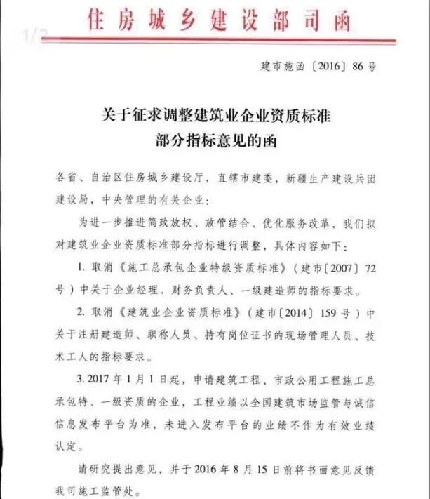 近日,住房和城鄉(xiāng)建設(shè)部建筑市場(chǎng)監(jiān)管司就“調(diào)整建筑業(yè)企業(yè)資質(zhì)標(biāo)準(zhǔn)部分指標(biāo)”征求意見(jiàn)(建市施函[2016]86號(hào)),主要內(nèi)容有以下兩點(diǎn):