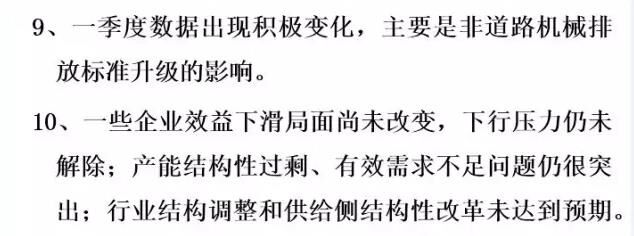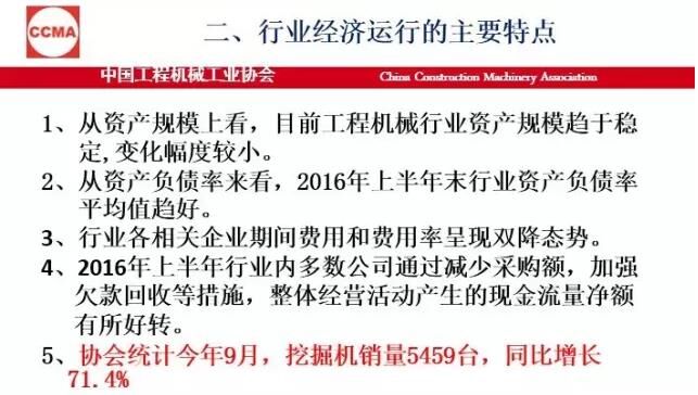我個人總結,今年的運行情況有這樣十個方面。第一,從整個全行業(yè)各企業(yè)的資產(chǎn)規(guī)模上看,目前趨于穩(wěn)定,變化幅度很小,不像前兩年振動那么大。第二,從資產(chǎn)負債率來說,現(xiàn)在負債率是在60%左右,全國的工業(yè)企業(yè)是56%。所以,這個行業(yè)的資產(chǎn)負債率目前看也是很好的。這個需要引起大家的關注和分析,我們也希望后幾個月情況可以穩(wěn)定向好。還有自主品牌市場占有率,在國內(nèi)市場還是保持高位,從全行業(yè)來看在90%以上。那么,產(chǎn)業(yè)的集中度又進一步地增強了,但有一些企業(yè)挺無助的,出局了,進口額下降。今年按照環(huán)保部5號令,全行業(yè)工程機械產(chǎn)品實現(xiàn)了新的標準升級。整個產(chǎn)品進行了更新?lián)Q代,這個非常難能可貴。最后是產(chǎn)能結構性過剩,有效需求不足問題仍然突出,行業(yè)結構調(diào)整還有供給側結構改革遠遠沒有達到預期。即便是按照現(xiàn)在的挖掘機銷量5500多臺,就算是6000臺,產(chǎn)能又有多少?一旦市場回暖,一些企業(yè)家還是會頭腦一熱,這樣大一個產(chǎn)能釋放出來的產(chǎn)量是什么局面?我們必須保持一個清醒的頭腦。